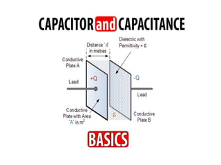 This document defines and explains capacitance and capacitors. It discusses that capacitance is the ability of a system to store electric charge, and is measured in Farads. A capacitor is made of two conductive plates separated by a dielectric material. The capacitance of a capacitor depends on the plate area, distance between plates, and dielectric material. Capacitors are used to temporarily store electric energy and have various applications in electronics.