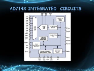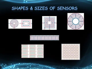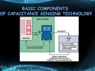 A capacitive sensor uses changes in capacitance to detect proximity or contact with a target. The sensor has a sensing area that produces an electric field, and a change in the gap between this area and a target alters the capacitance in a way that can be measured. Capacitive sensors are used for applications like touchscreens, thickness measurement, and position sensing due to their non-contact operation and insensitivity to the target material. They provide flexibility and cost advantages over mechanical switches in human-machine interfaces.