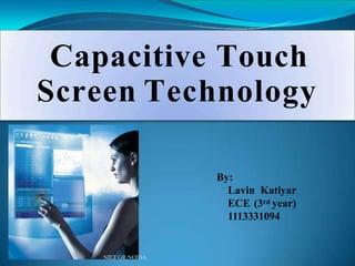 Capacitive touch screens work by detecting changes in capacitance when a finger touches the screen. There are two main types: surface capacitive uses a uniform conductive coating while projected capacitive uses a grid of wires. A touch screen has three main components - a touch sensor, controller, and software driver. The controller translates touches to coordinates and the driver allows the screen and computer to work together. Capacitive touch screens are widely used due to their high resolution, clarity, and responsiveness.