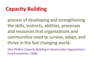 This document discusses capacity building and knowledge creation in organizations. It defines capacity building as developing skills, abilities, and resources to help organizations adapt and thrive. Capacity building can occur at the individual, institutional, and societal levels. It is important for innovation, efficiency, effectiveness, stability, and survival. However, capacity building does not happen naturally and requires recognizing needs, strategies, and investing time and money. Knowledge is at the base of capacity building and exists in both formal and informal ways. It can be created through participation and reification using a knowledge spiral process of socialization, externalization, combination, and internalization. For educational institutions, knowledge creation can occur through curriculum reforms, continued learning opportunities, knowledge services, dynamic