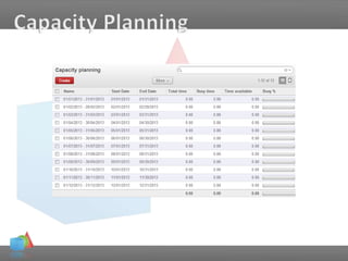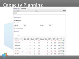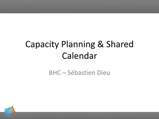 The document outlines a presentation by Sébastien Dieu focusing on capacity planning and a shared calendar system, emphasizing the impact on company organization and cost optimization. It details the current setup, including the capacity for workload and features of the shared calendar, which allows for efficient resource planning. A live demo is mentioned, along with a call for questions, highlighting the importance of better client service and satisfaction.