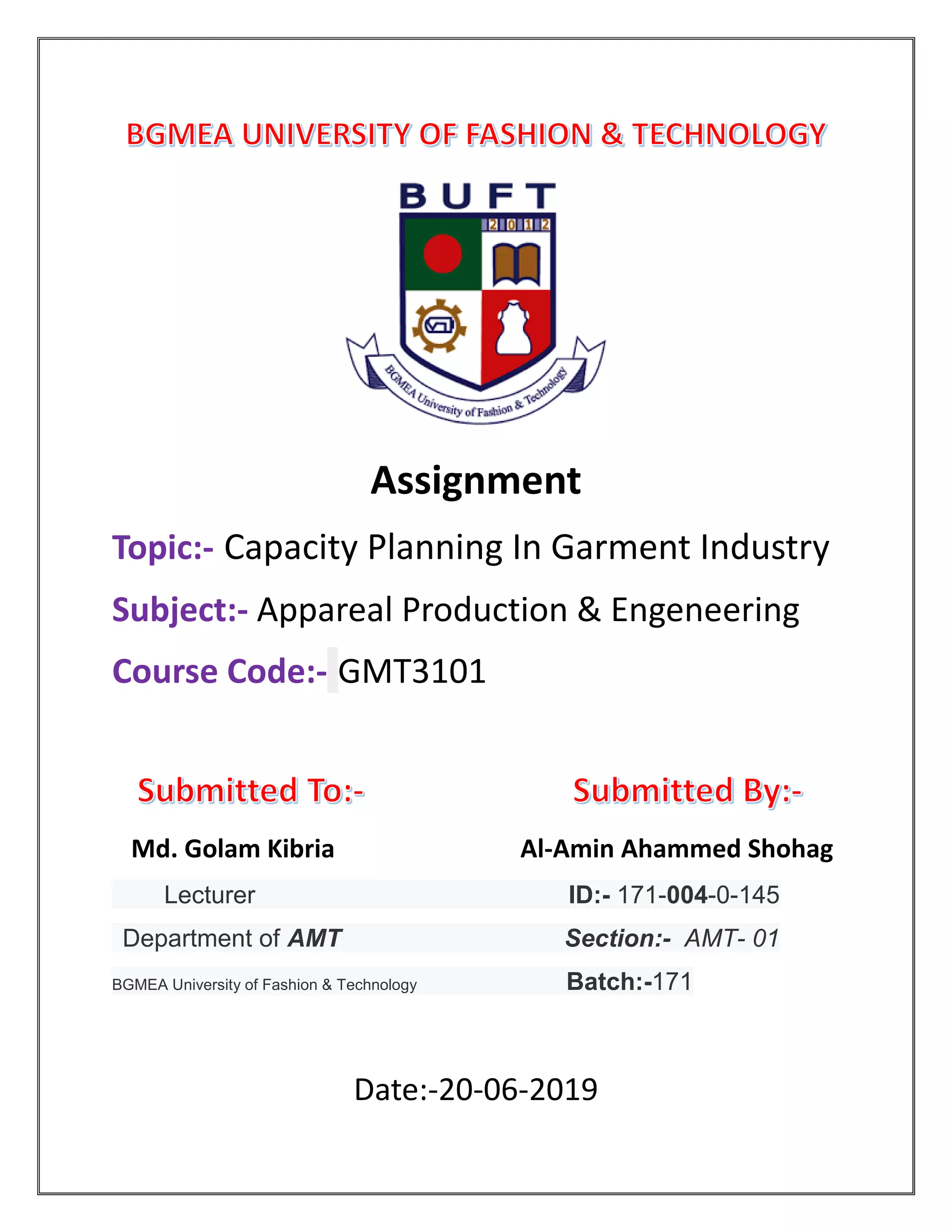 This document provides information about capacity planning in the garment industry. It discusses calculating production capacity based on the number of machines, operating hours, and efficiency levels. It also covers production planning and control, line balancing, modeling a sewing line in simulation software, and factors to consider in manpower allocation and production planning for a new garment business. The document contains examples and steps involved in capacity planning, production planning, and setting up a new garment manufacturing business.