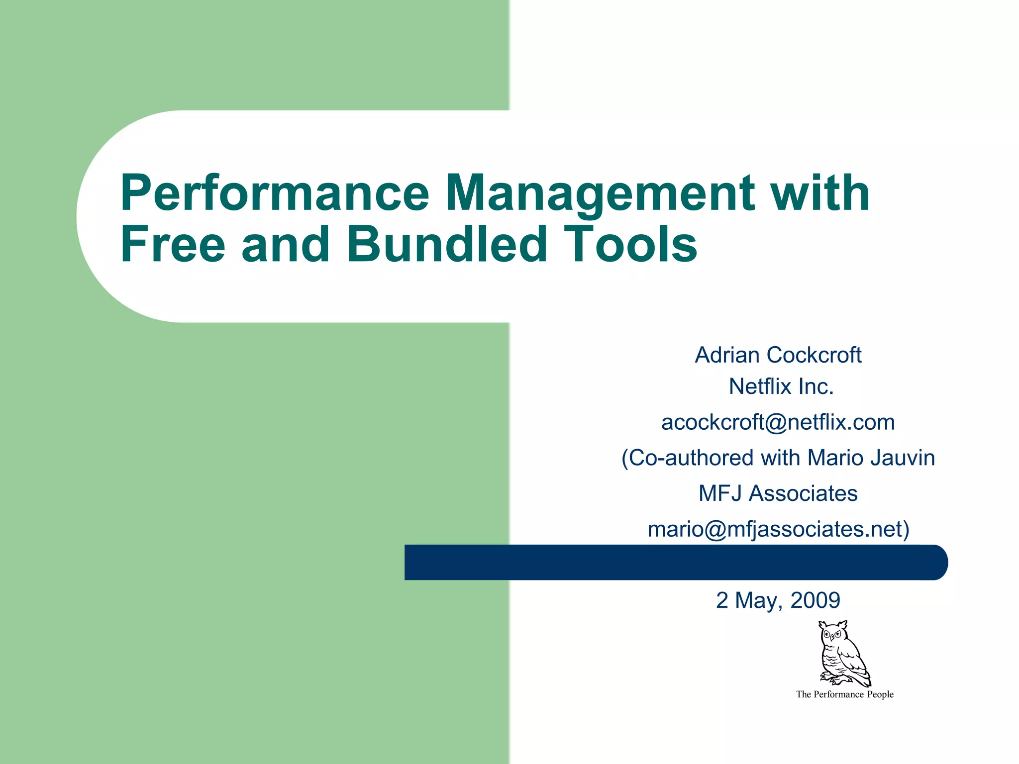 El documento aborda la gestión del rendimiento en sistemas utilizando herramientas gratuitas y empaquetadas, destacando la planificación de la capacidad y la recopilación de datos de rendimiento. Se mencionan herramientas específicas para monitoreo de redes y sistemas, así como los desafíos en la planificación de capacidad y la observabilidad desde diferentes perspectivas (gestión, ingeniería, QA, operaciones). Finalmente, se describen diversas herramientas y protocolos, como SNMP, para la recolección y visualización de datos de rendimiento.