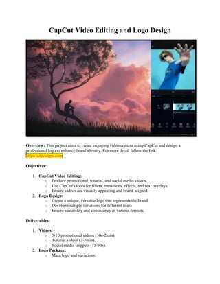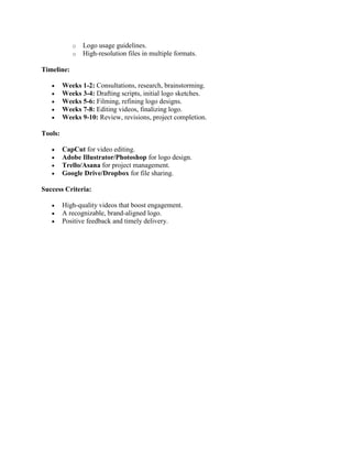 This project focuses on using CapCut for video editing and creating a professional logo to enhance brand identity. Deliverables include multiple promotional and tutorial videos along with a comprehensive logo package, while the timeline spans ten weeks for consultations, drafts, filming, and final edits. Success will be measured by video quality, logo recognition, and positive feedback.