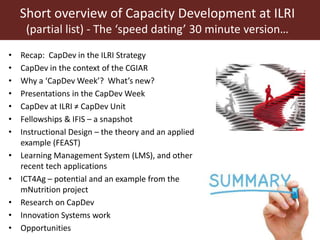This document provides an overview of capacity development initiatives at the International Livestock Research Institute (ILRI), highlighting the objectives, recent advancements, and ongoing projects related to enhancing capacity. It details the structure of capacity development, the significant role of fellowships, the application of instructional design, and the use of technology in learning and research. Key initiatives include the establishment of online courses, a new learning management system, and collaborative projects aimed at improving food security and innovation in livestock systems.
