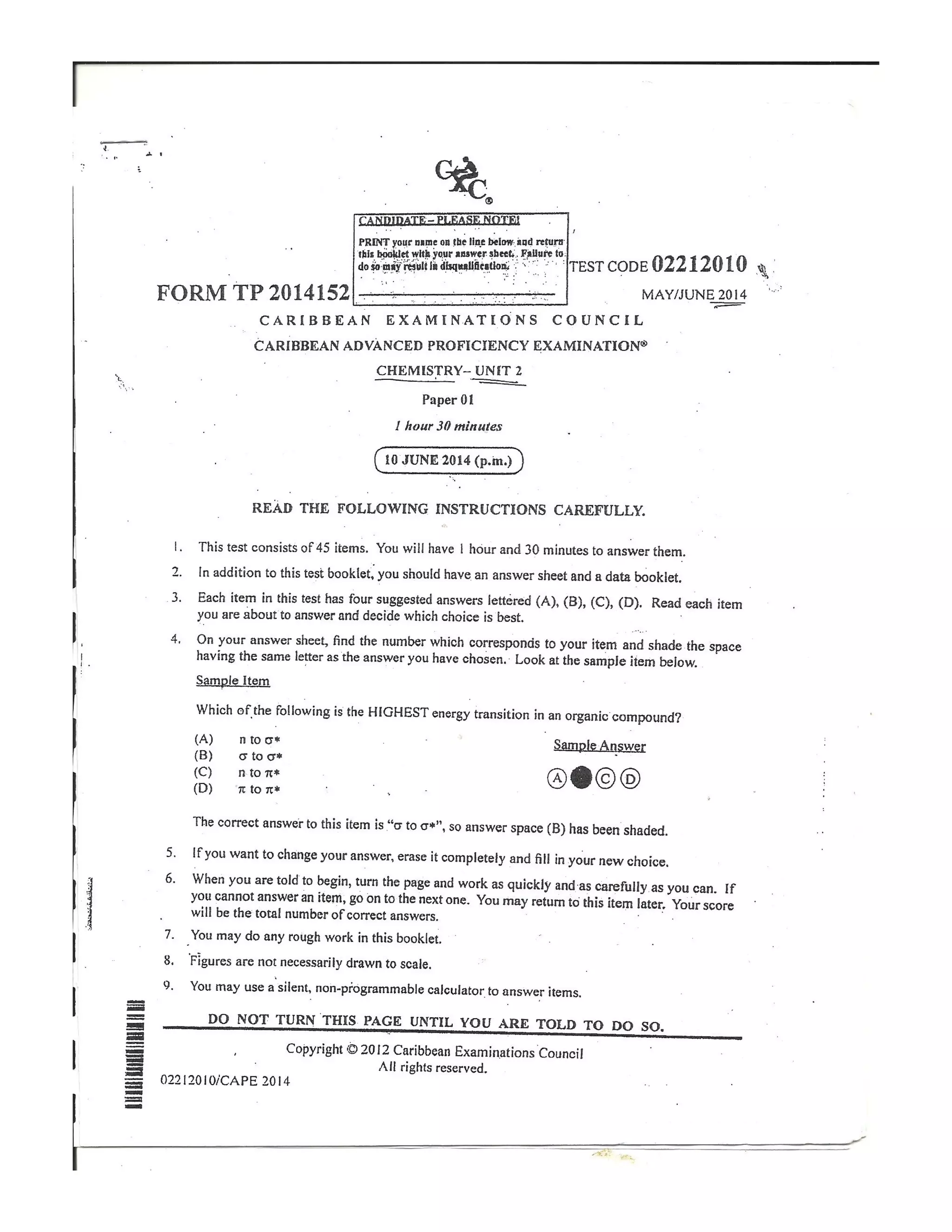 CAPE Chemistry Unit 2 Paper 1 (multiple choice) 2014