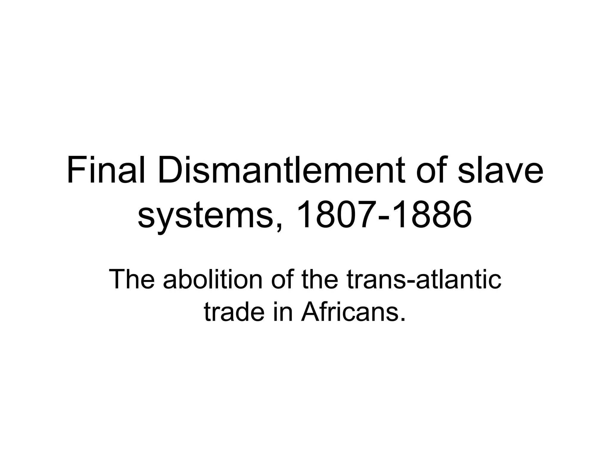 The document discusses the final dismantlement of slave systems between 1807-1886. It provides details on the abolition of the trans-Atlantic slave trade by various countries from 1803-1824. It then examines the factors that led to the British abolition of the slave trade in 1807, including the work of abolitionists, the Haitian Revolution, economic reasons, and changes in government. Opposition to the slave trade included resistance by enslaved people in Africa and the Americas as well as activism by white abolitionists, black abolitionists like Olaudah Equiano, and women's groups.
