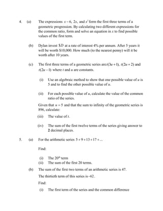 This document contains practice questions on sequences, series, and approximations from a CAPE Pure Mathematics unit. Question 1 covers finding terms of sequences defined recursively and evaluating finite sums. Question 2 involves finding expressions for terms of sequences defined recursively and finding their sums. Later questions cover topics like proving identities using induction, evaluating infinite series, approximating functions using Taylor series, and finding roots of equations numerically. The questions provide worked examples of key concepts in sequences, series, and approximations.