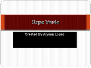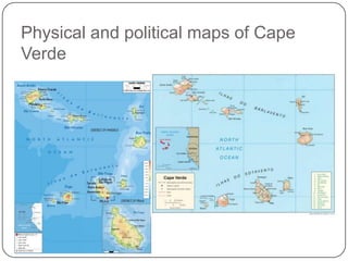 This document provides information about Cape Verde, including its flag featuring 10 stars in a circle, the capital city of Praia, and Santiago Island's international airport. It also mentions Cape Verde's currency, emblem, food, health centers, music, exports, and cultural activities like weaving.