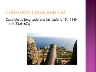 This document provides various facts about Cape Verde, including its location at 15.1111N 23.6167W, physical features such as the Ilhas de Barlavento islands and North Atlantic Ocean, capital city of Praia, majority Catholic religion and Creole language, republic government, agriculture of beans and fish, 350 days of sunshine per year, and a population of 498,897.