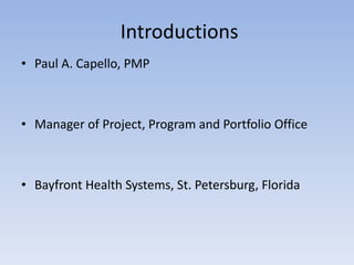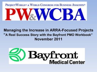 The document discusses Bayfront Health Systems' successful use of a Project Management Office (PMO) Workbook to manage an increase in projects focused on the American Recovery and Reinvestment Act (ARRA). It outlines how the PMO Workbook helped with documentation, tracking project scope, changes, risks, and issues. Metrics show Bayfront achieved a 95% success rate for on-time and on-budget project completion since implementing the PMO Workbook in 2004, significantly higher than industry averages.