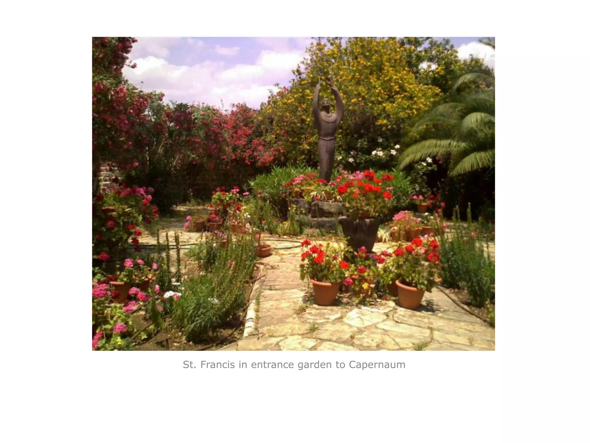 The document provides a photographic tour of sites in Capernaum, including sculptures of St. Francis and St. Peter, the remains of a synagogue and olive press, and views of the modern Church of St. Peter and the Sea of Galilee. It features photographs of gardens, buildings, architectural details, and the landscape around Capernaum.