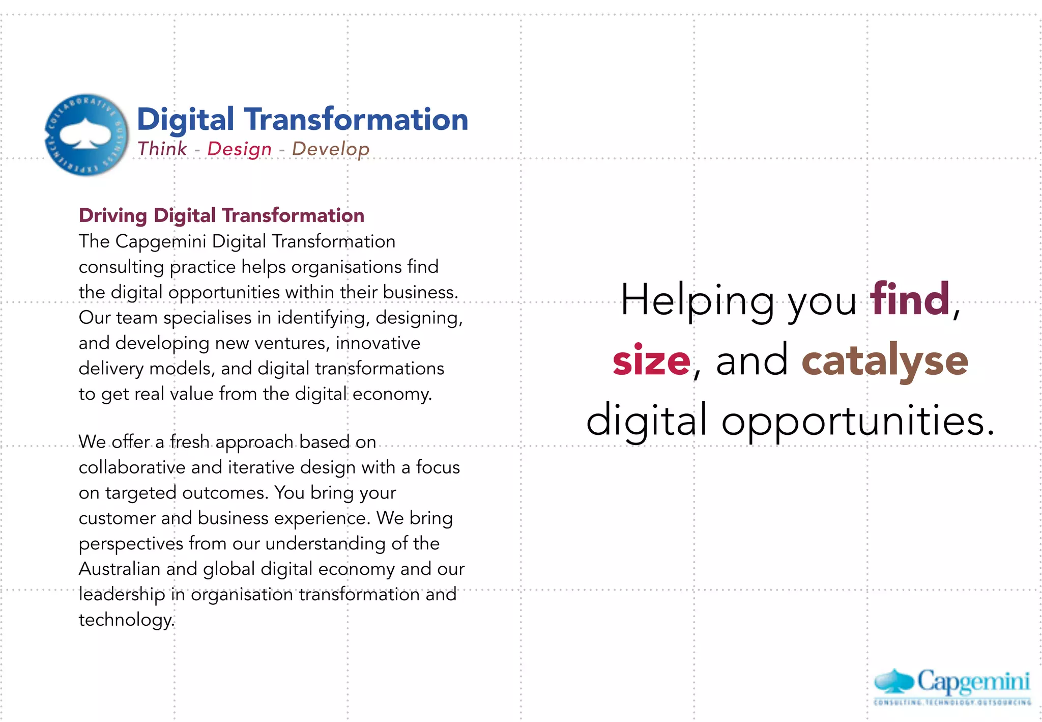 The document discusses the role of Capgemini's digital transformation consulting practice in helping organizations identify and leverage digital opportunities to drive real value. It emphasizes the importance of collaborative design and iterating through innovative processes to achieve targeted outcomes in the digital economy. Furthermore, it highlights the challenges organizations face in fostering an innovation culture and the necessity for a defined innovation strategy.