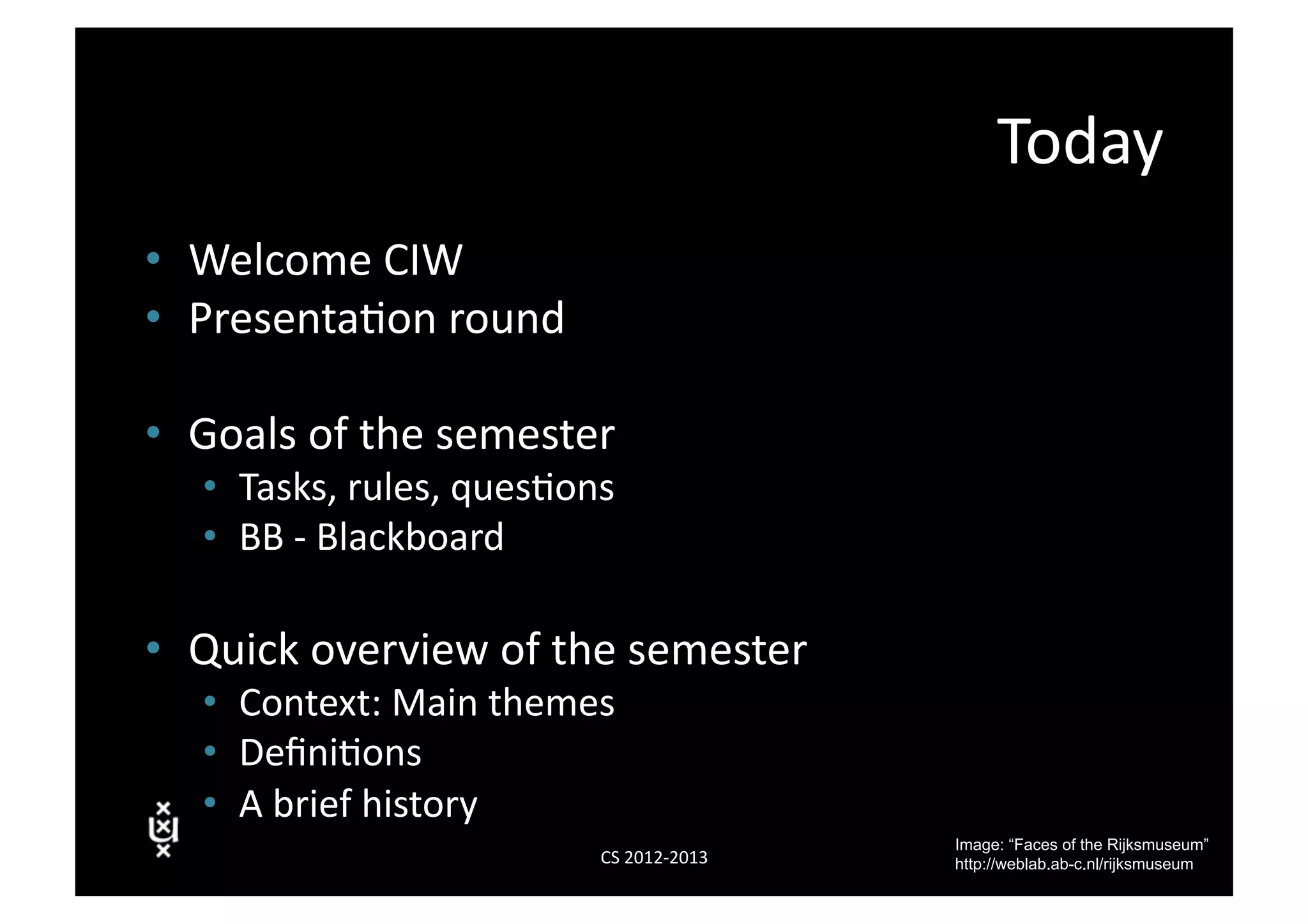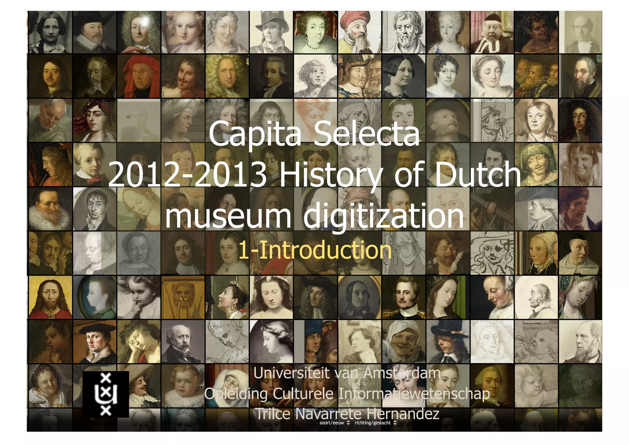 This document provides an overview of a course on the history of museum digitization in the Netherlands from 1960-2011. The course will examine the main themes of policy, financing, organizational change, and users of digitized heritage content. Students will complete individual written analyses, literature reviews, and a final research project analyzing a theme and applying theories of cultural informatics. The document defines key terms related to Dutch museums, their relationship to the government, and provides a brief contextual history of museum digitization.