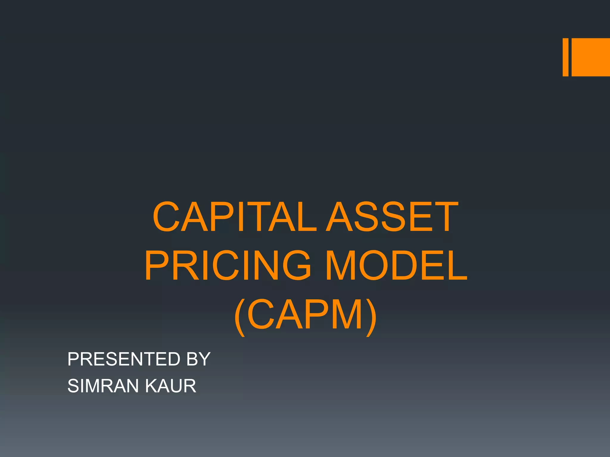 The document provides an overview of the Capital Asset Pricing Model (CAPM). It defines key terms like the capital allocation line, capital market line, security market line, beta, and expected return. The capital allocation line shows the risk-return tradeoff for efficient portfolios. The capital market line depicts the risk-return relationship for efficient portfolios available to investors. The security market line is a graphic representation of CAPM that describes the market price of risk. CAPM holds that the expected return of an asset is determined by its beta, or non-diversifiable risk. It assumes investors will hold an efficient portfolio consisting of a risk-free asset and the market portfolio.