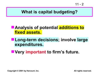 The document discusses capital budgeting and methods for evaluating investment projects such as net present value (NPV) and internal rate of return (IRR). It explains that NPV is the best method for choosing between mutually exclusive projects as it accounts for the time value of money and assumes cash flows are reinvested at the opportunity cost of capital. The document also introduces the modified internal rate of return (MIRR) as an alternative to IRR that makes the same reinvestment rate assumption as NPV.
