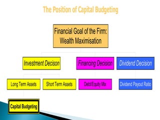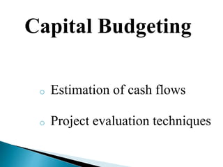 The document discusses various capital budgeting techniques for evaluating investment projects. It outlines steps for estimating cash flows, including determining net cash outflows, annual cash flows, and final year cash flows. It then explains several evaluation techniques like average rate of return, payback period, discounted payback period, net present value, internal rate of return, and profitability index. The techniques consider factors like time value of money, risk, and whether the technique is consistent with maximizing shareholder wealth. NPV is highlighted as the preferred technique, though others provide supplementary insights into risk, costs, and returns.