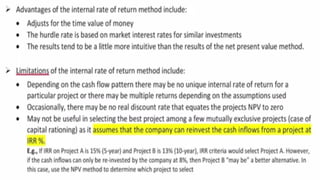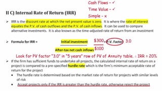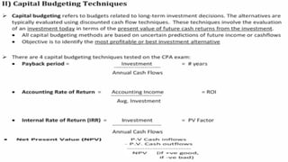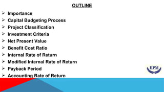 This document provides an overview of capital budgeting techniques. It discusses the importance of capital budgeting and the process involved. It then defines various investment criteria used to evaluate projects, including net present value, benefit-cost ratio, internal rate of return, payback period, and accounting rate of return. Formulas for calculating each are presented along with their advantages and disadvantages. Risk analysis techniques like sensitivity analysis and decision trees are also summarized.