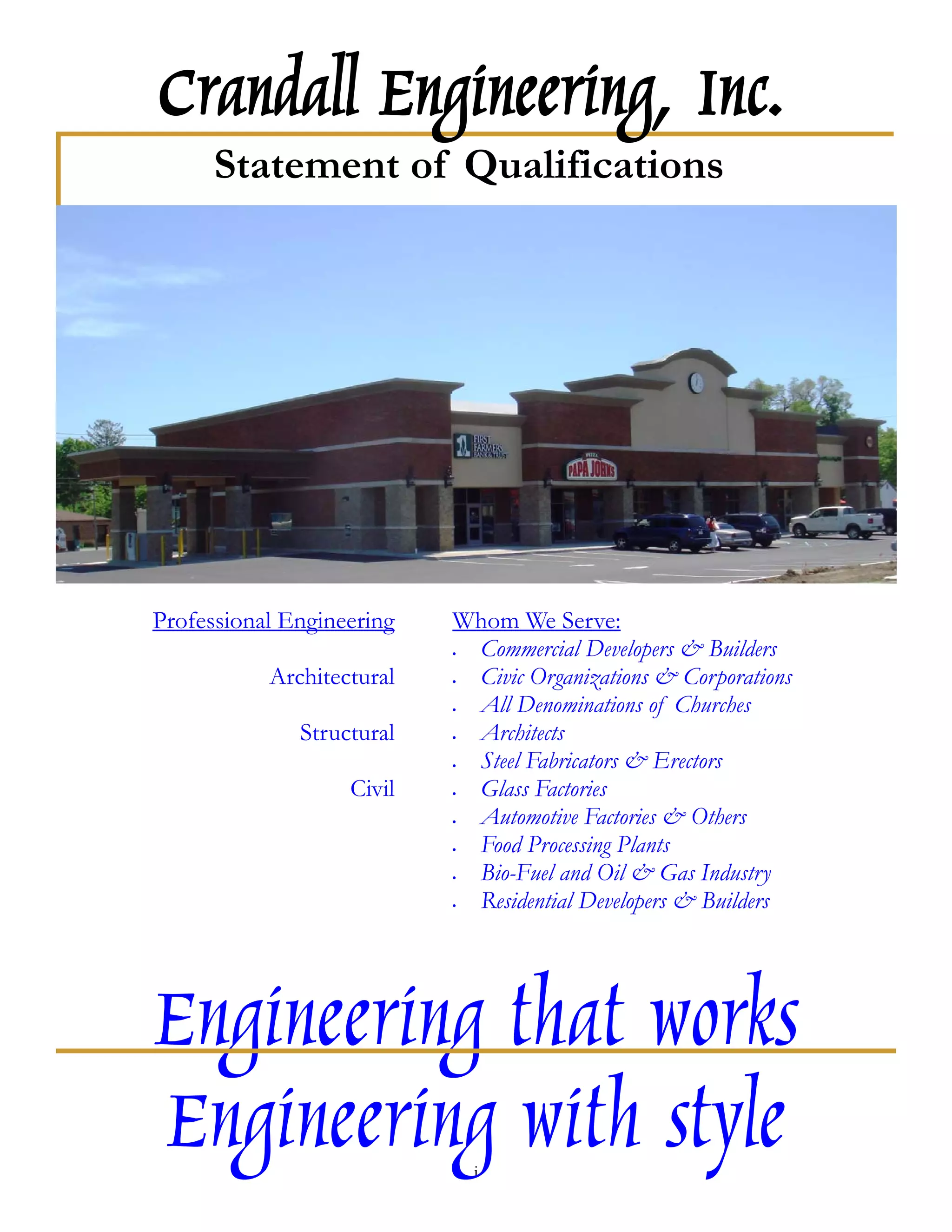Crandall Engineering, Inc. is a full-service architectural and professional engineering firm based in Gas City, Indiana, serving a diverse range of clients including commercial developers, civic organizations, and various industries. Established in 2002, the firm emphasizes a team-oriented approach to project management and offers services in structural analysis, historical building remediation, and design of various facilities while maintaining a focus on customer needs and sustainable practices. The principal, Lisa Crandall, leads a team skilled in managing projects that vary from community centers to complex structural designs, ensuring all objectives are met within budget and time constraints.