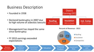 The document summarizes an investment analysis of Owens Corning (OC), a building materials company. Key points include: