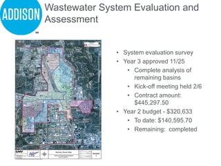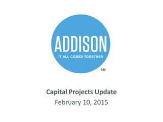 The document provides an update on various capital projects as of February 10, 2015, including wastewater system evaluations, land acquisition efforts, and ongoing construction activities with budgetary details. Key highlights include the progress of the Addison Circle rehabilitation, street reconstruction, and pedestrian connectivity projects, with various phases in different stages of completion and financing. Additionally, a feasibility study for a dog park is being conducted, with designs to be presented to the council in the coming months.
