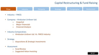 The document discusses Hindustan Unilever Ltd's capital structuring and fund raising. It summarizes HUL's financial performance, noting that it is an unleveraged company with a high dividend payout ratio and return on net worth. The document also analyzes HUL's investments, noting they have grown at a 27% CAGR over 5 years. Finally, the document discusses an potential acquisition of REI Agro Ltd in the food processing sector to extend HUL's food portfolio.