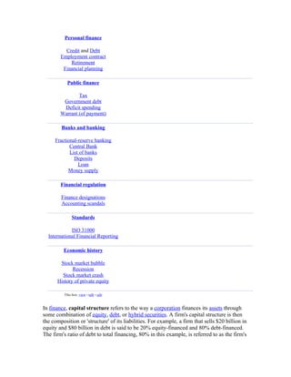 Capital structure refers to how a company finances its assets through a combination of equity, debt, or hybrid securities. A company's capital structure is the composition of its liabilities, such as a firm financed by 20% equity and 80% debt. The Modigliani-Miller theorem states that in a perfect market, a company's capital structure does not affect its value. However, in the real world, factors like taxes, bankruptcy costs, and information asymmetry make capital structure relevant by affecting a company's optimal financing mix and value. Common capital structure theories examine the tradeoffs between debt and equity financing.