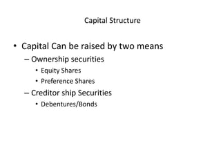The document discusses capital structure, which refers to the mix of long-term financing sources like equity shares, preference shares, debentures, and retained earnings that a company uses. It provides examples of different capital structure patterns that companies can use, including all equity, equity with preference shares, and combinations including debt. The optimal capital structure balances the costs and benefits of debt versus equity to maximize shareholder value. Formulas for calculating earnings per share under different capital structures and the indifference point between structures are also presented.