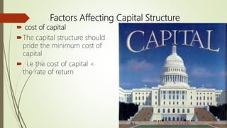 The document discusses capital structure, defined as the mix of debt and equity used to finance a firm's operations. It highlights factors influencing capital structure, including cost of capital, company size, control, requirements, and government policies. Small firms typically rely on loans and retained profits, while larger firms can issue shares and debentures, subject to regulatory constraints.