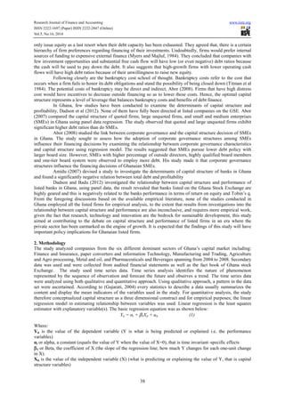 Regression analysis was conducted using these variables. The analysis found that short term debt, long term debt, and total equity accounted for a small percentage of the variations in return on equity, return on assets, and return on total capital. Specifically, short term debt and total equity had a positive relationship with performance measures, while long term debt had a negative relationship.