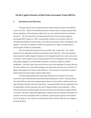 This paper examines the capital structure of Real Estate Investment Trusts (REITs) to understand how they choose between different financing options. It analyzes whether there is a relationship between market-to-book ratios and leverage ratios for REITs, and whether market-to-book ratios have a temporary or long-term impact on leverage. The paper finds that REITs with high market-to-book ratios tend to have high leverage ratios, and that historical market-to-book ratios have a long-term persistent impact on current leverage ratios. These findings support pecking order theory for REIT capital structures.
