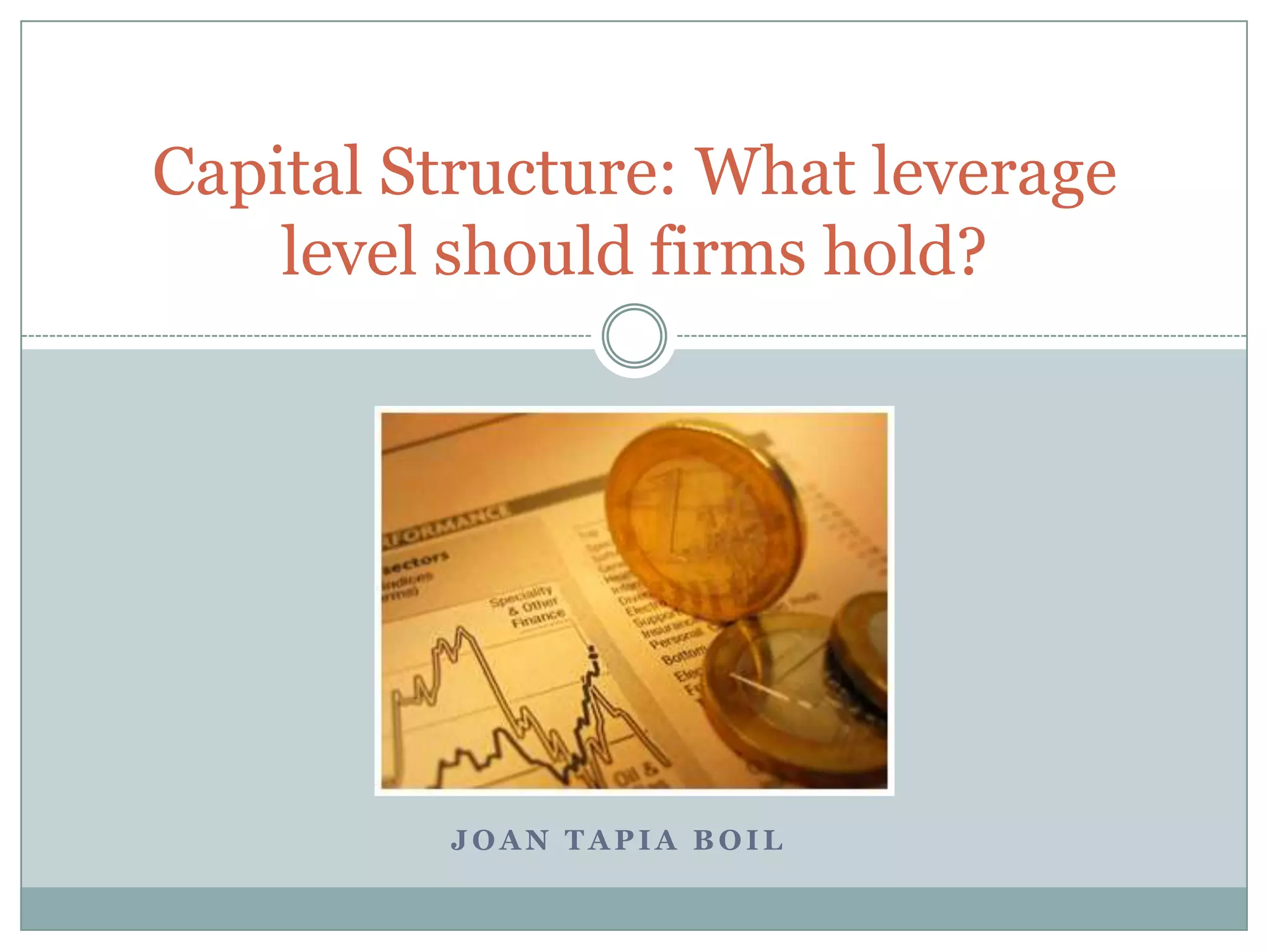 This document discusses capital structure and the different theories around the optimal leverage level for firms. It covers the trade-off theory, which balances the tax benefits of debt against the costs of financial distress, and the pecking order theory, which states firms fund investments first through retained earnings, then debt, and finally equity. It also discusses agency costs theory and how the relationships between shareholders, creditors, and managers influence capital structure. The conclusion is that no single theory can fully explain capital structure choices and the optimal leverage level depends on firm-specific characteristics.