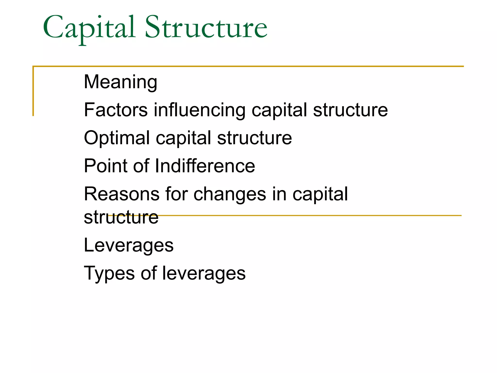 The document discusses capital structure, which refers to the composition of a company's long-term financing, including loans, reserves, shares, and bonds. It outlines factors that influence a company's capital structure such as financial leverage, risk, growth, and external conditions. The document also discusses the concept of an optimal capital structure that maximizes firm value and minimizes the cost of capital. It notes different types of leverage including financial, operating, combined, and working capital leverage and how they impact a company's earnings and risk.