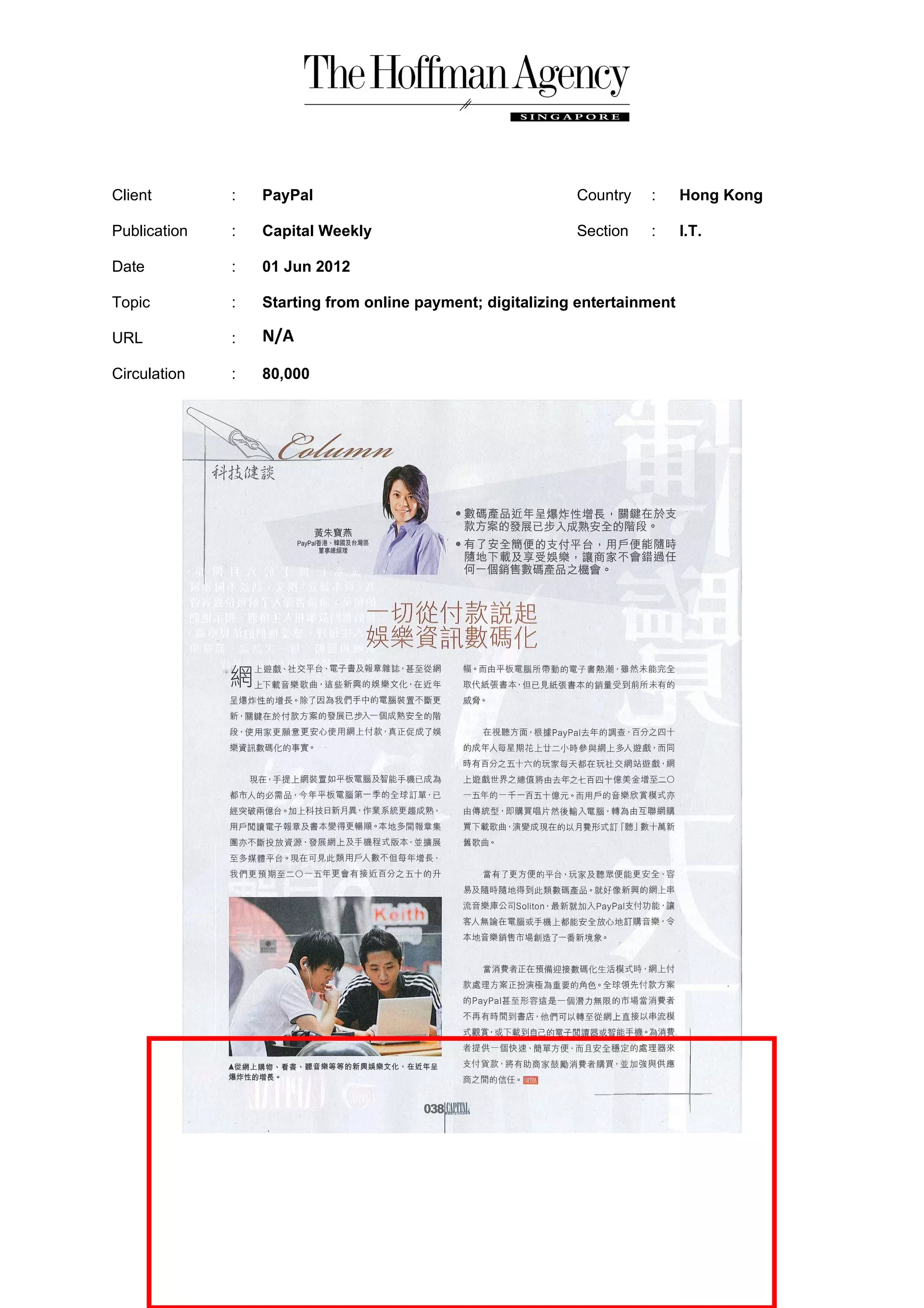 PayPal was featured in an article in the Capital Weekly publication in Hong Kong on June 1, 2012. The article discussed how PayPal started as an online payment platform and has since expanded into digitizing entertainment content. The Capital Weekly has a circulation of 80,000 readers.