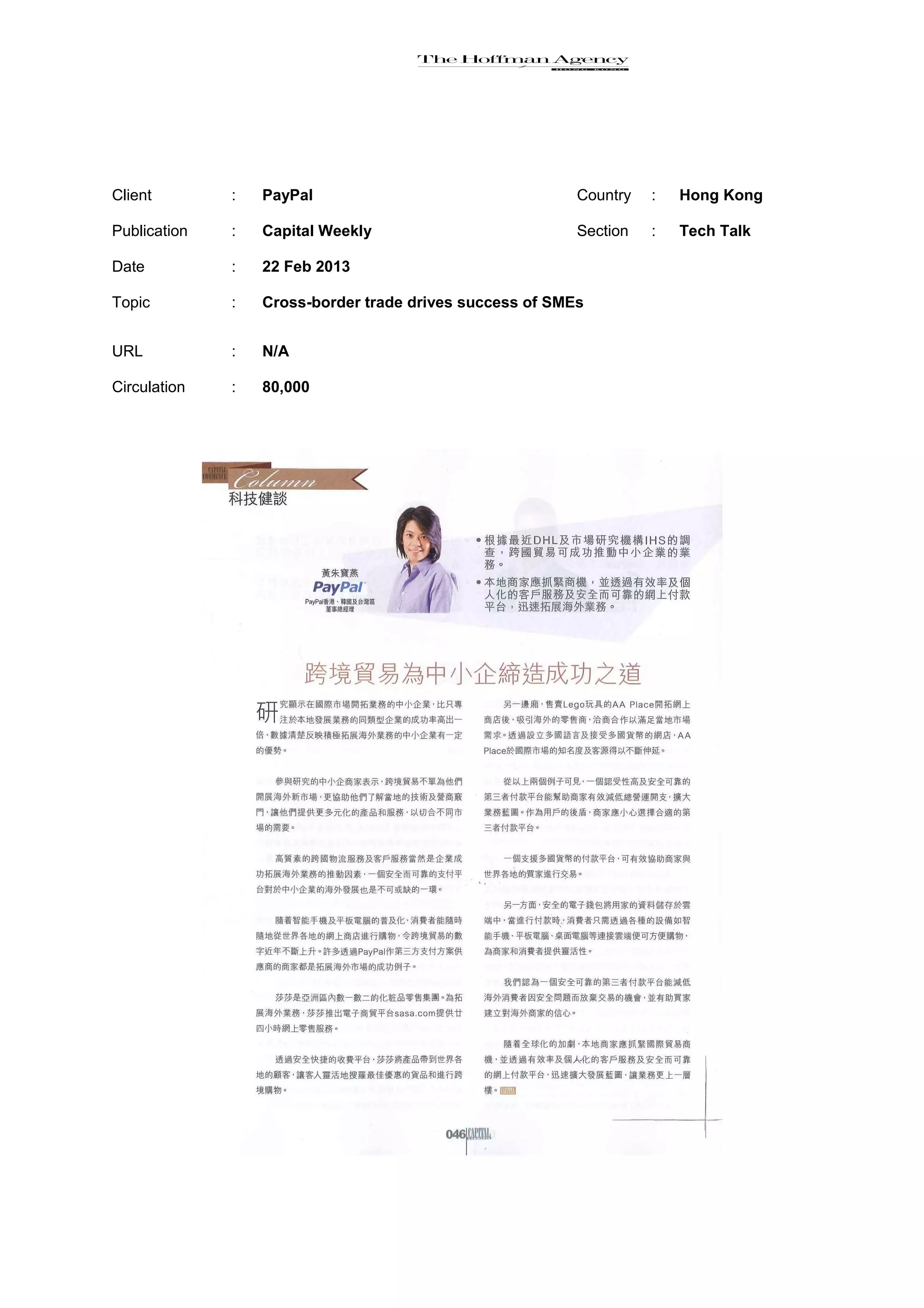 PayPal was featured in a Hong Kong publication discussing how small and medium-sized enterprises (SMEs) are benefiting from cross-border trade. Cross-border trade is driving the success of SMEs by allowing them to reach new international customers and markets online. The article discusses how PayPal enables SMEs to accept payments from around the world, expanding their customer base beyond local borders.