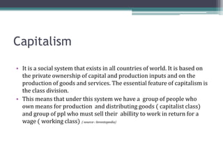This document discusses the issues with capitalism and proposes solidarity-based economy as an alternative. It provides examples of how solidarity-based practices have helped developing regions like Bosnia and Herzegovina. Specifically, it summarizes that capitalism has led to issues like inequality, poverty and environmental degradation when profit is the sole motive. However, solidarity-based models focus on cooperation and local development, empowering small communities through associations like a raspberry farmers' cooperative in Bosnia that generates income for thousands while investing back into the community. The document argues capitalism must integrate ethical values and support local development through community groups for economic systems to be truly sustainable and beneficial.