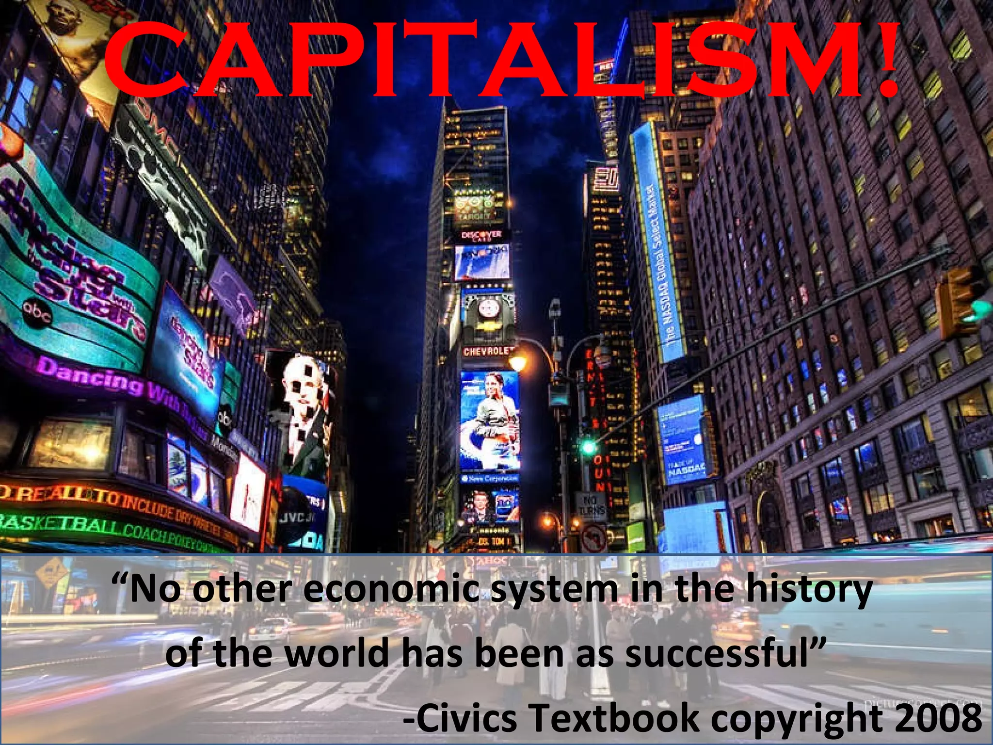 The document defines and explains key aspects of capitalism. It states that capitalism is an economic system based on private ownership and free markets where individuals can own and use resources to seek profit. It operates on principles like free enterprise, competition, economic freedom, private property rights, the profit motive, and voluntary exchange between buyers and sellers. The document argues that these features of capitalism have made it the most successful economic system in history.