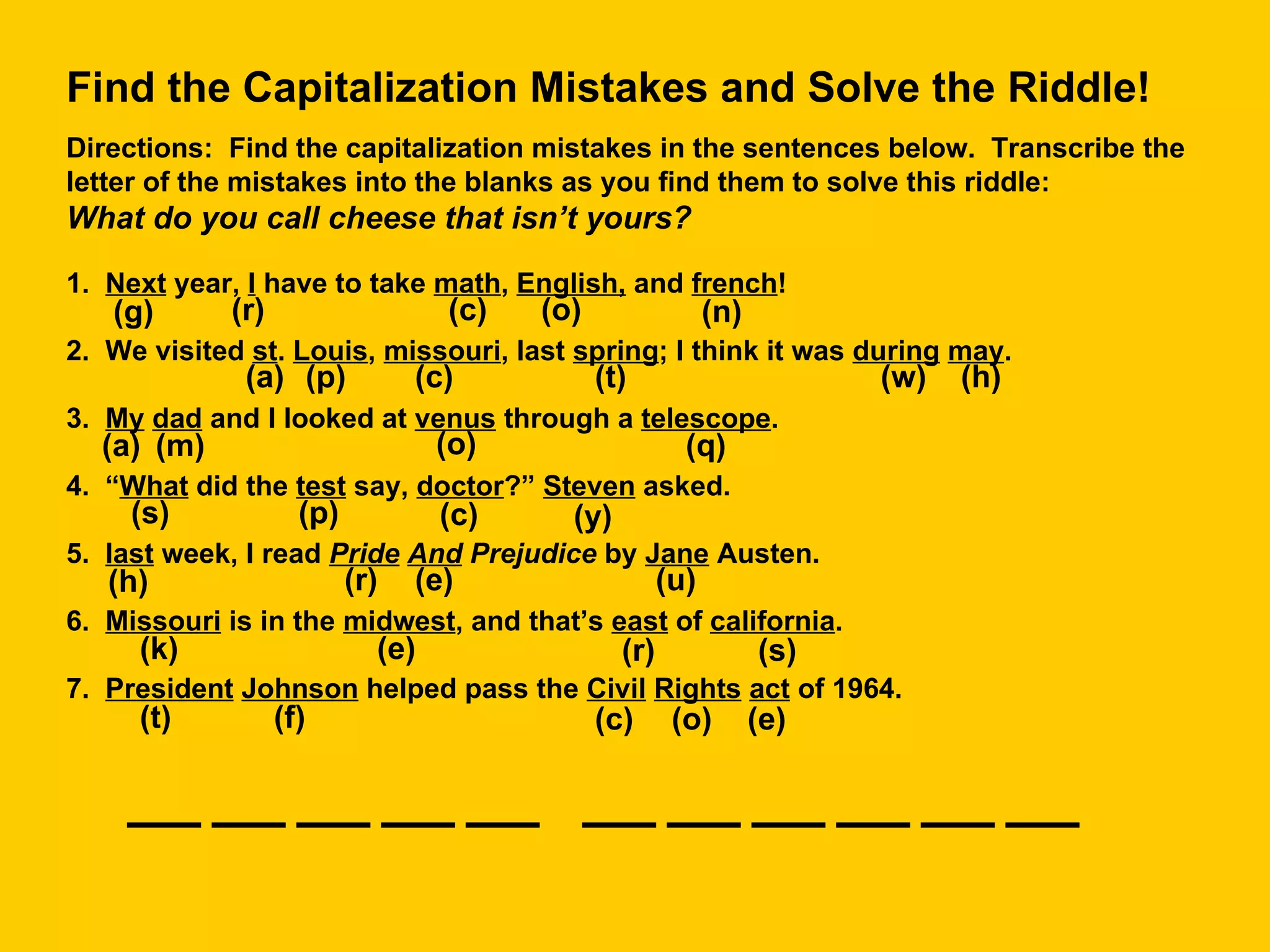 The document provides rules for capitalization. It discusses capitalizing the pronoun "I" and the exclamation "O"; capitalizing the first word of a sentence; capitalizing the first word of quoted sentences if they are complete sentences; capitalizing proper nouns and modifiers associated with them; capitalizing a person's title when preceding their name with exceptions; capitalizing points of compass when referring to regions; capitalizing the first and last words of titles with other rules for capitalizing words within titles; capitalizing days of week, months, and holidays but not seasons with exceptions; and capitalizing words derived from proper nouns.