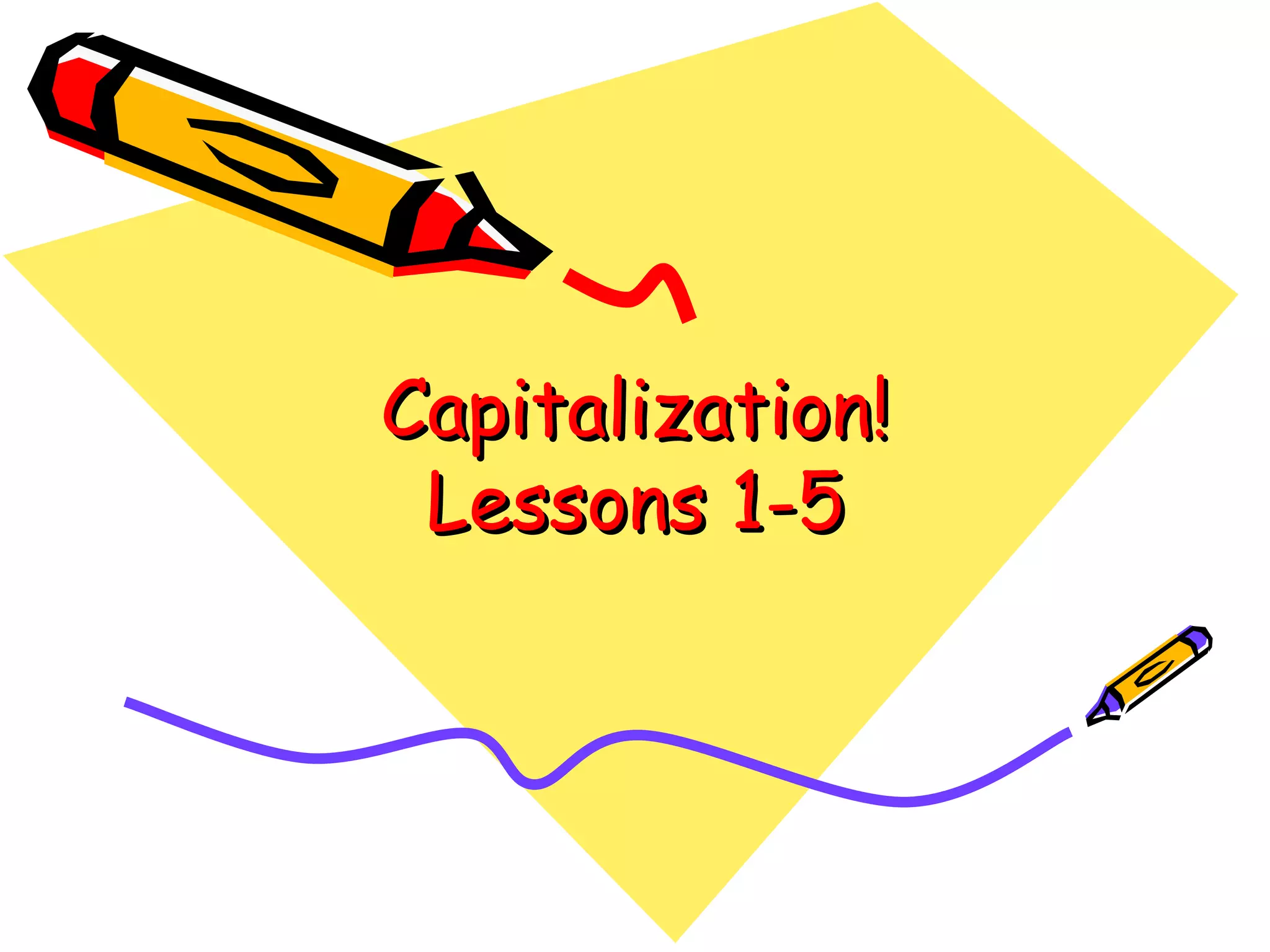 The document provides lessons on capitalization rules, including capitalizing proper nouns and adjectives like names and titles; pronouns like I; religions and locations like names of continents, countries, cities, and directions; institutions and events; languages and holidays; object names and abbreviations; greetings and closings; and titles of works. It gives examples of words that should and should not be capitalized according to the specific rules.