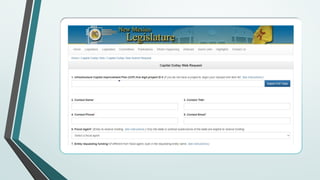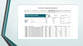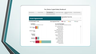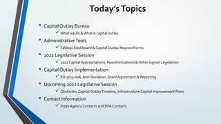 The document provides information about capital outlay administration in New Mexico. It discusses the role of the Capital Outlay Bureau in coordinating funding and oversight of capital projects. It outlines tools like the capital outlay dashboard and request forms. It summarizes capital appropriations from the 2022 legislative session. It also discusses the capital outlay implementation process including executive orders, grant agreements, and the capital projects monitoring system. Contact information is provided for state agency capital outlay representatives.