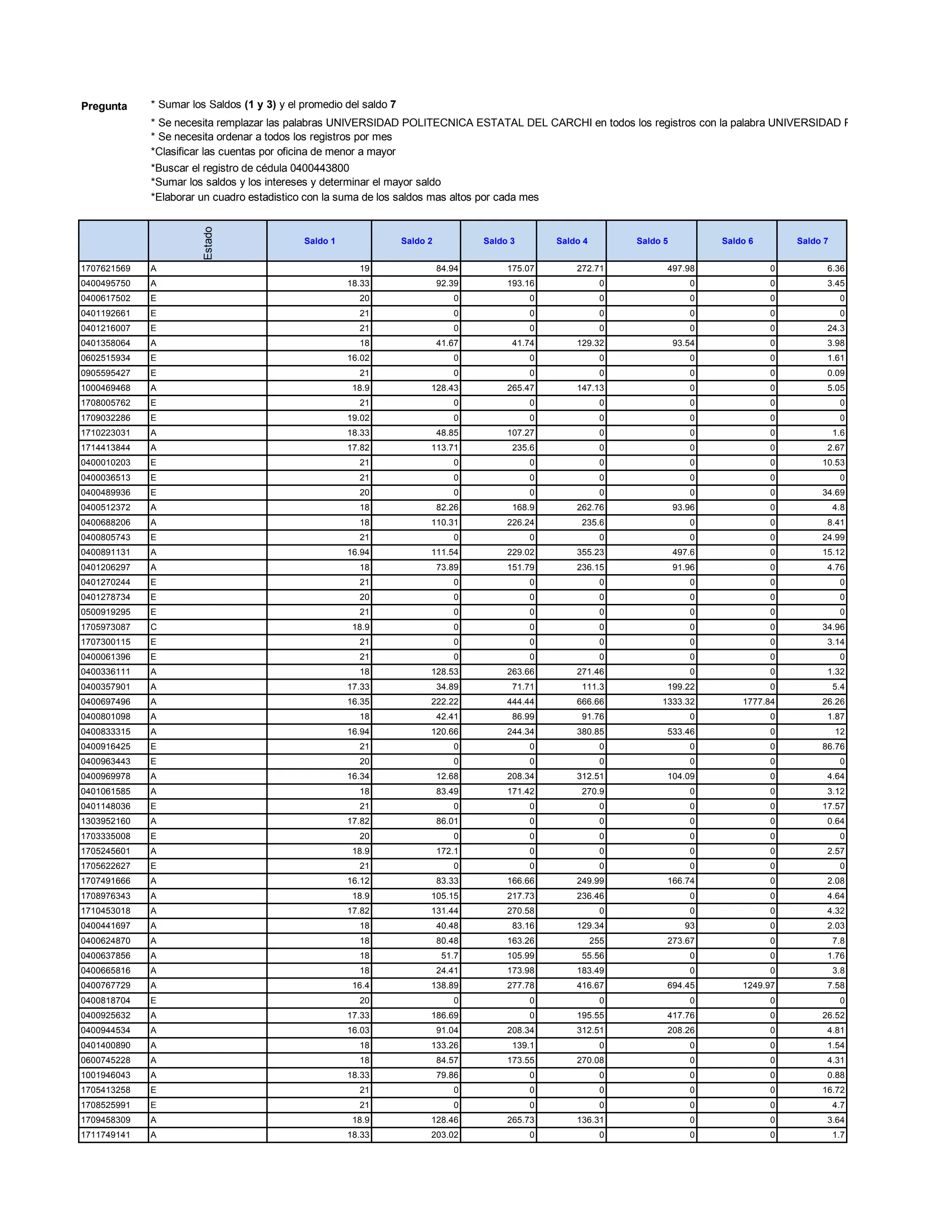The document contains a table with student records including cedula number, office, month, balances and interests. It lists several questions:
