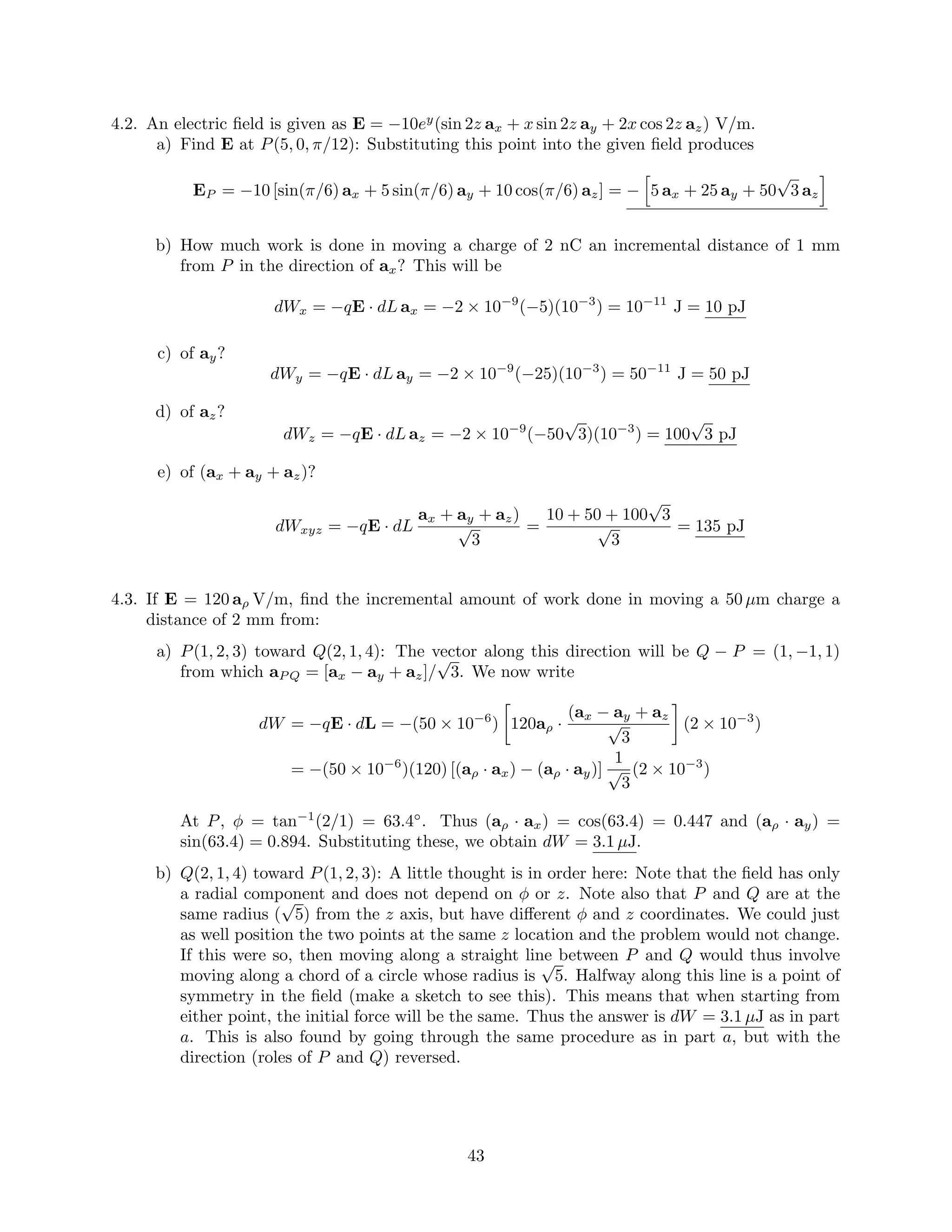 1. The document provides calculations for determining work done by electric fields on charges moving through various paths. It includes determining incremental work from given electric field expressions and calculating potentials from different charge distributions.