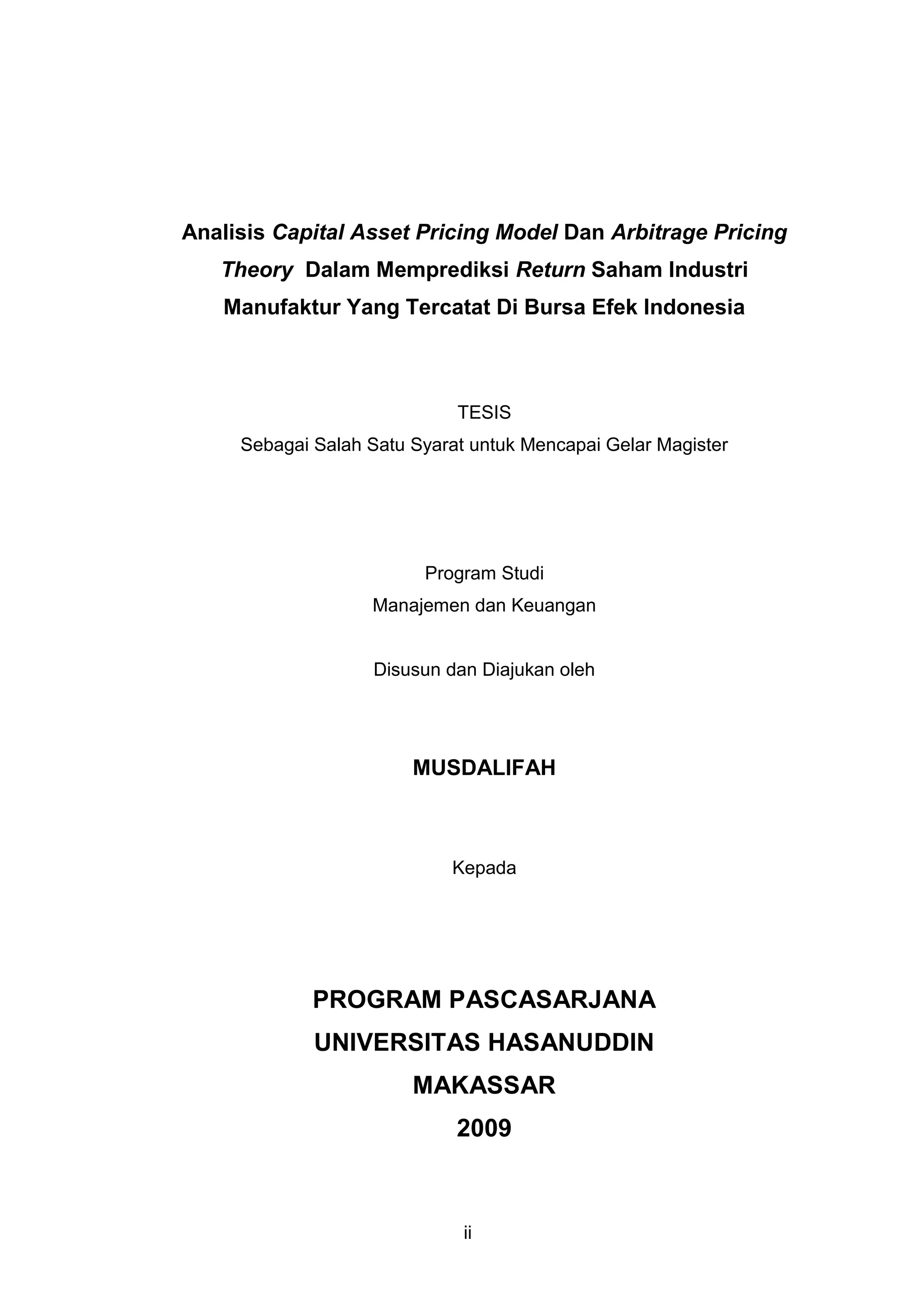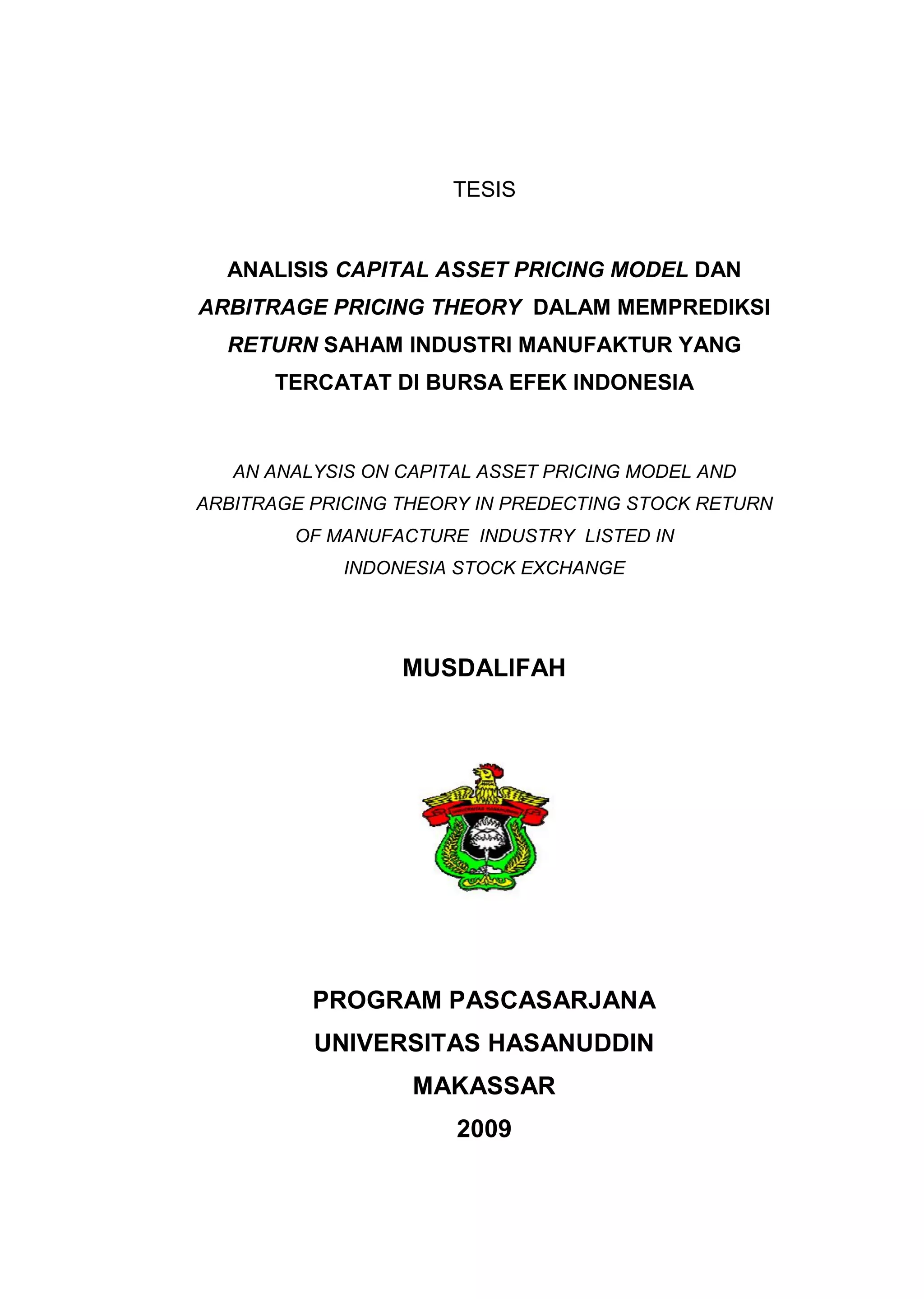 Tesis ini menganalisis penggunaan Capital Asset Pricing Model (CAPM) dan Arbitrage Pricing Theory (APT) dalam memprediksi return saham industri manufaktur yang terdaftar di Bursa Efek Indonesia. Penelitian menunjukkan bahwa kedua model memiliki pengaruh signifikan terhadap return saham dan menyoroti perbedaan antara expected return dari masing-masing model. Metode yang digunakan melibatkan analisis regresi dan uji beda dua rata-rata sampel, dengan hasil yang menunjukkan perbedaan yang signifikan antara CAPM dan APT.
