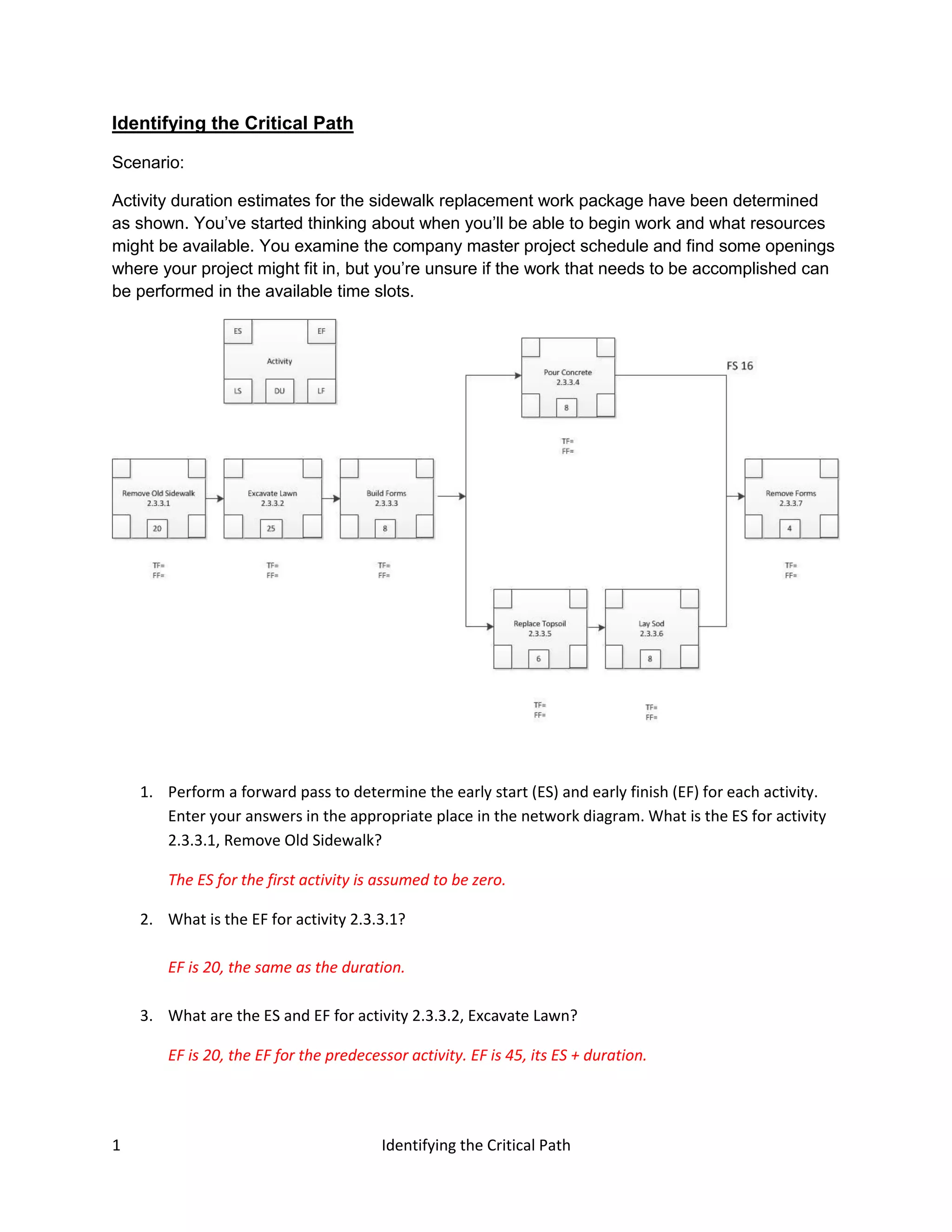 The document describes identifying the critical path for a project involving replacing a sidewalk. It involves performing forward and backward passes on the network diagram to determine early/late start and finish dates for each activity. The critical path is determined to be activities 2.3.3.1 through 2.3.3.4 plus the 16-hour lag for concrete curing before 2.3.3.7 can finish, totaling 81 hours. Activities 2.3.3.5 and 2.3.3.6 have 10 hours of total float but share it, so increasing one activity's duration would reduce the other's float.