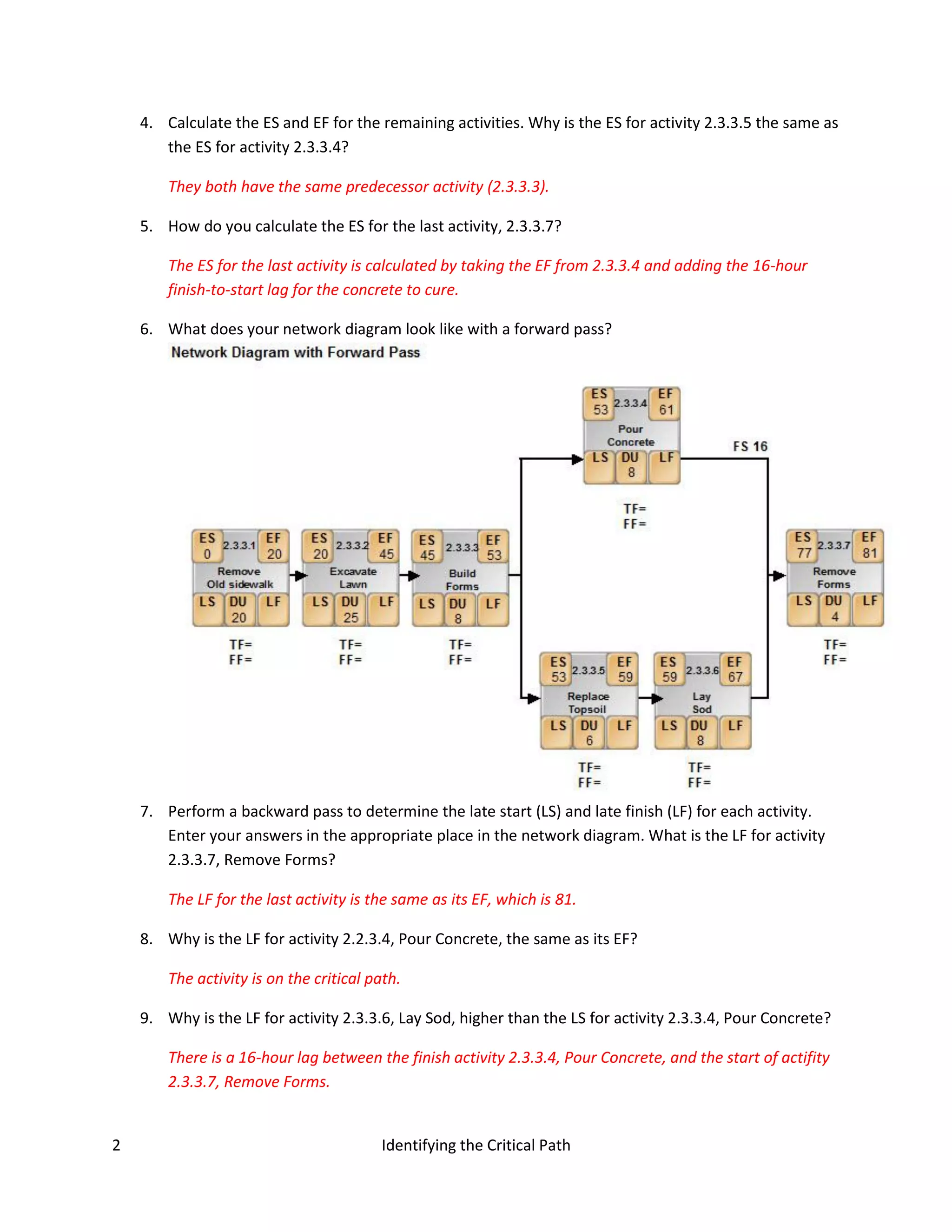 The document describes identifying the critical path for a project involving replacing a sidewalk. It involves calculating early start, early finish, late start and late finish dates for each activity by performing forward and backward passes on the network diagram. The critical path is determined to be activities 2.3.3.1 through 2.3.3.4 plus 2.3.3.7, totaling 81 hours. Activities 2.3.3.5 and 2.3.3.6 have 10 hours of total float but share it, so increasing one activity's duration would decrease the other's float.