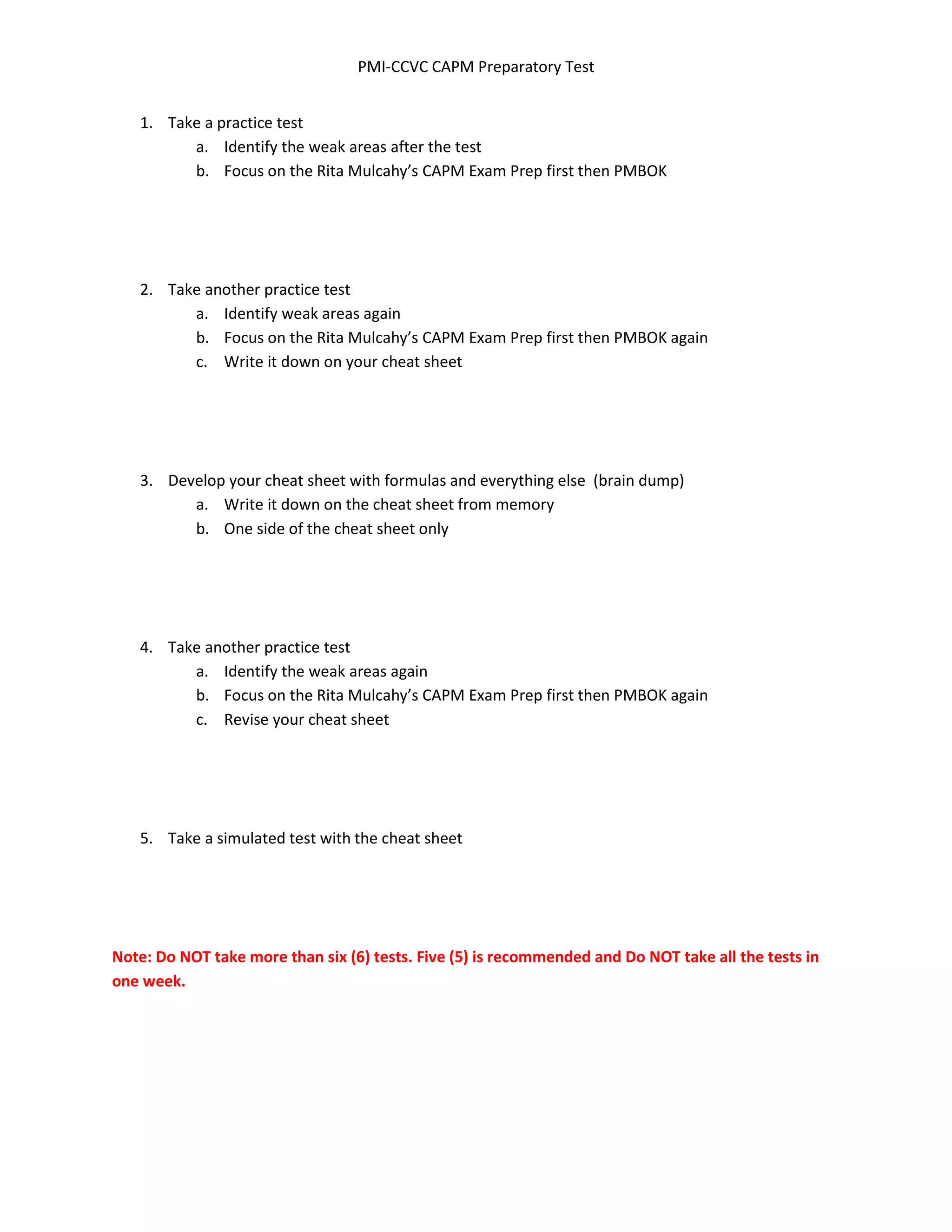 2. Take another practice exam, again identify weaknesses, and restudy using Mulcahy and PMBOK. Write notes on a one-sided cheat sheet.