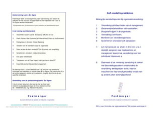 Gratis training Lean & Six Sigma Postmerger biedt uw management gratis* een training aan waarin de Belangrijke aandachtspunten bij organisatieverandering: valkuilen en het nut voor uw organisatie bij het toepassen van Lean & Six Sigma worden behandeld. * Bij organisaties vanaf 100 werknemers en onder voorbehoud van beschikbaarheid trainer 1. Verandering zichtbaar leiden vanuit management; 2. Gezamenlijke behoefte en visie vaststellen; In de training wordt behandeld: 3. Draagvlak krijgen in de organisatie; Verschillen tussen Lean & Six Sigma, valkuilen en nut 4. Verandering ‘bevriezen’; Klant (Voice of the Customer) en Interne klant (Voice of the Business) 5. Monitoren van veranderingsproces; 6. Systemen en processen ook aanpassen; Klantgroep en diensten (Value Mapping) Vertalen van de klantwens naar de organisatie 7. Let met name ook op ‘what’s in it for me’, d.w.z. Doen we wat de klant verwacht? (De 9 vormen van verspilling) duidelijk aangeven naar medewerkers en Symptomen, oorzaken, knelpuntenanalyse management waarom de verandering voor hen Een goed verbeterplan individueel interessant is. Toepassen van de Ease Impact matrix en keuze door MT 8. Daarnaast is het verstandig aansluiting te zoeken Essentiële punten bij verandermanagement met beoordelingssysteem omdat anders de De training duurt 1 uur en heeft tot doel u te voorzien van praktische verandering wel begrepen wordt, maar er informatie over valkuilen en nut van Lean & Six Sigma. De training kan bij u misschien niet naar wordt gehandeld omdat men op kantoor gegeven worden en maatwerk is mogelijk door focus op een specifiek onderdeel. op andere zaken wordt afgerekend. Aanmelding voor de gratis training Lean & Six Sigma: Winst verbet ering ants Org anis atieadv Ver and ies consult ering U kunt contact opnemen door een e-mail te sturen aan Overt Pr ojecto uig r ganisa Pro en ces ck tie ment Manag ch e de ambi Feedba tie Analytis Actiepla n robrecht.heukers@postmerger.nl of via telefoonnummer manage Compe tentieo ntwikk Eendu eli ng idige bood schap Draagv Afdel lak Senior ingsov erstijg ende Gesp reksp concep ten 06 – 44990498 (drs. ing. Robrecht Heukers). artne r ur Ketens seigenaren ties amenh ang Reg isse Scena ri o’s Gedr ag Interven Best pract Proce Betro ices uwba ar den Comm unicat ie Veran derdo Sturen el ductie Metho Verand Samen teit ercapa ci d Kostenre de org met anisatie Big Fou r achterg ron d Postmerger Postmerger duurzaam identificeren en oplossen van knelpunten in organisaties duurzaam identificeren en oplossen van knelpunten in organisaties www.heukersadvies.nl is eigenaar van www.postmerger.nl, www.ikhebplanschade.nl en www.mijnzienswijze.nl. ©2011 Heukers advies, Postmerger is een concept van Heukers advies, aan deze brochure kunnen geen rechten worden ontleend Wilt u meer informatie over organisatieadvies? Kijk op www.postmerger.nl