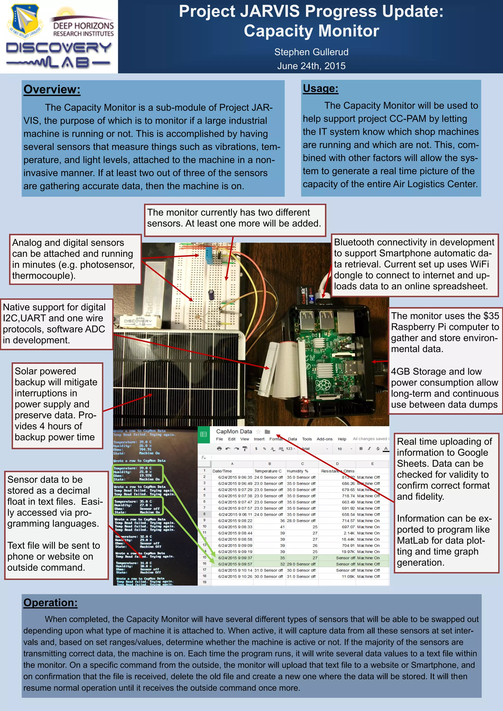 The Capacity Monitor is being developed as part of Project JARVIS to monitor the usage status of machines in a shop in real-time. It uses multiple sensors attached to each machine to determine if it is running or not. When completed, it will be able to swap between different sensor types depending on the machine. The monitor collects data from the sensors periodically and uploads it to a file or website upon receiving an external command, then deletes the old file. This will provide real-time information on machine capacity across the entire facility.
