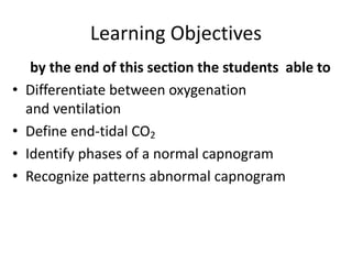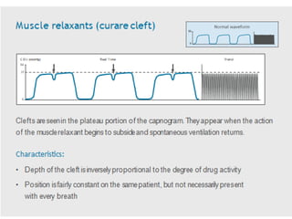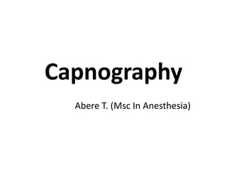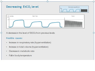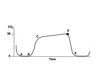 Capnography is used to continuously monitor carbon dioxide levels in exhaled breath. It provides information about ventilation by measuring end-tidal carbon dioxide (EtCO2). The capnogram displays breath-by-breath CO2 levels and has four phases - phases I and IV show no CO2 as air is in the dead space, phase II is the ascending slope as alveolar gas mixes with dead space air, and phase III is the alveolar plateau that shows uniform CO2 levels in exhaled breath and is used to measure EtCO2. Abnormal capnogram waveforms can indicate issues like bronchospasm, esophageal intubation, or rebreathing. Capnography is a useful monitoring