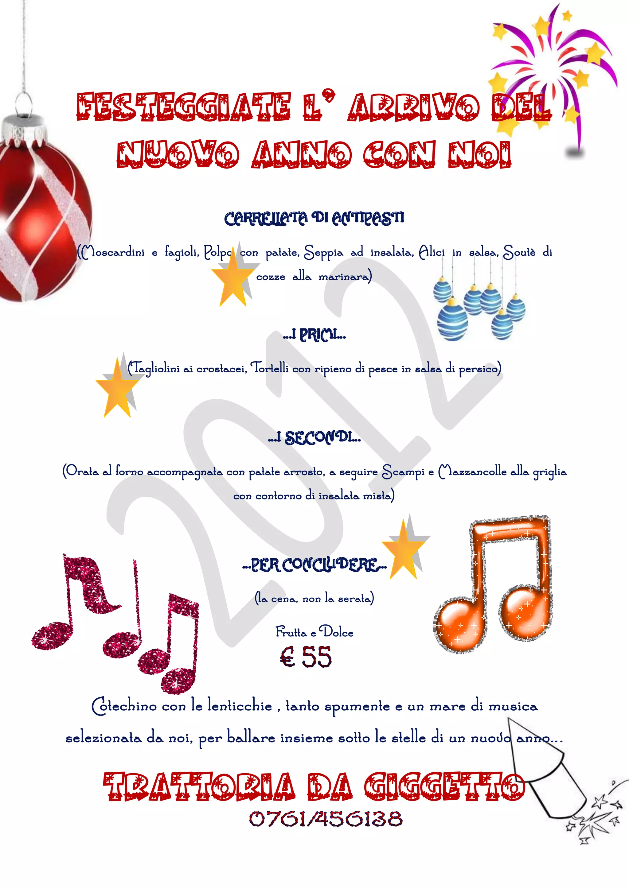 Il documento invita a festeggiare l'arrivo del nuovo anno con un ricco menu che include antipasti di mare, primi piatti a base di pesce, secondi di orata, scampi e dolci tradizionali. Il festeggiamento è accompagnato da spumante e musica per ballare sotto le stelle. L'evento si svolgerà presso la trattoria da Giggetto.